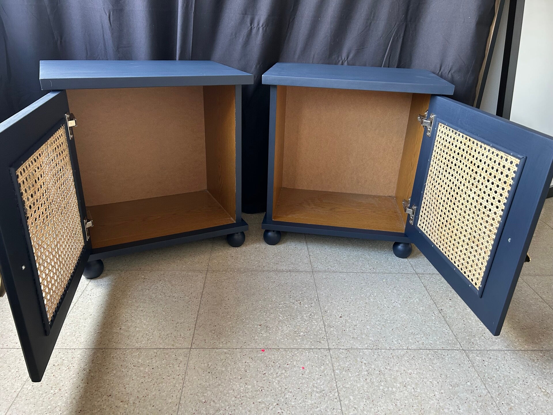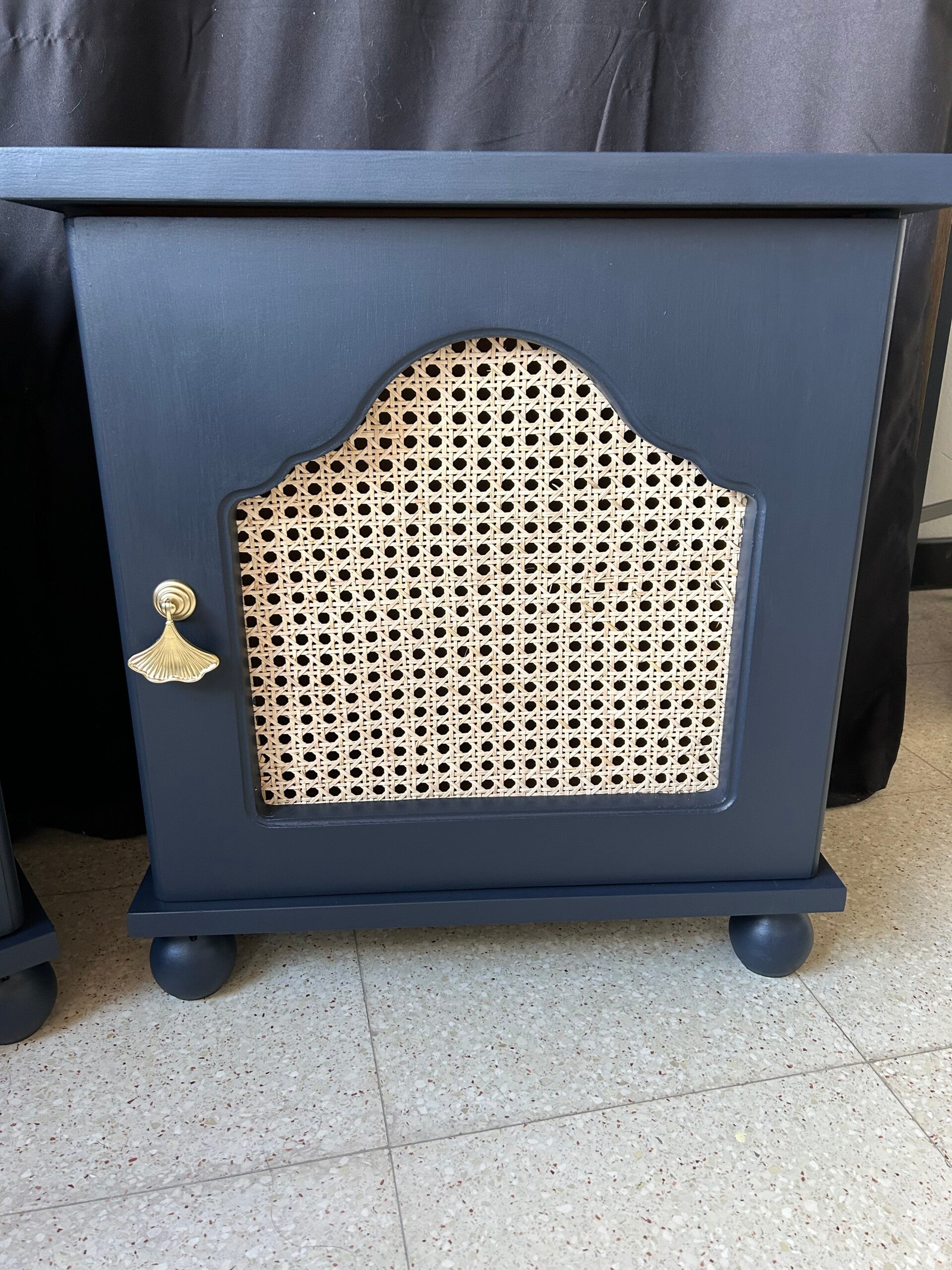 Geschilderd in Midnight Blue, met nieuwe handgreepjes & het middenstuk van de deurtjes werd vervangen door mooi rotan!
